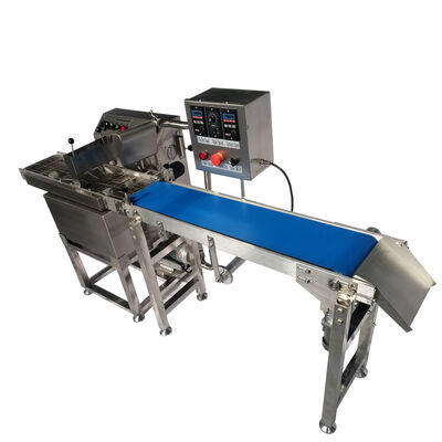 The chocolate melting tank is used to melt the chocolate into liquid and for warm keeping, the chocolate pump is used for chocolate liquid transferring to the chocolate enrobing machine tank. There are two options for chocolate coating: 1. Chocolate covering machine with cooling tunnel. 2. Chocolate coating machine with cooling fan conveyor. Cooling tunnel is much bigger size compared to the fan cooling conveyor, but the choclate enrobing machine with cooling fan conveyor is mostly used in shops, kitchen or at home. The chocolate enrobing machine with cooling tunnel can be used for industrial purpose. We have industrial type chocolate enrobing line for customer to choose, the industrial type chocolate enrobing line is with much bigger size and much longer cooling tunnel.